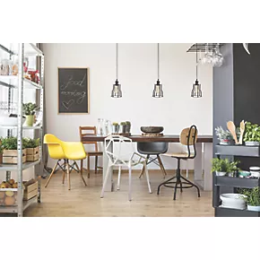 Decorative black bell-shaped cage pendant with fully adjustable 1.5m fabric cable allowing for varied installation height. Ideal for kitchen areas and living spaces.