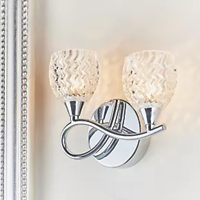 Chrome twin wall light with curved metal arms and cut glass shades. Suitable for use with LED lamps and dimmable when used with dimmable bulbs. Supplied with 2 x 2.5W warm white G9 LED capsules.